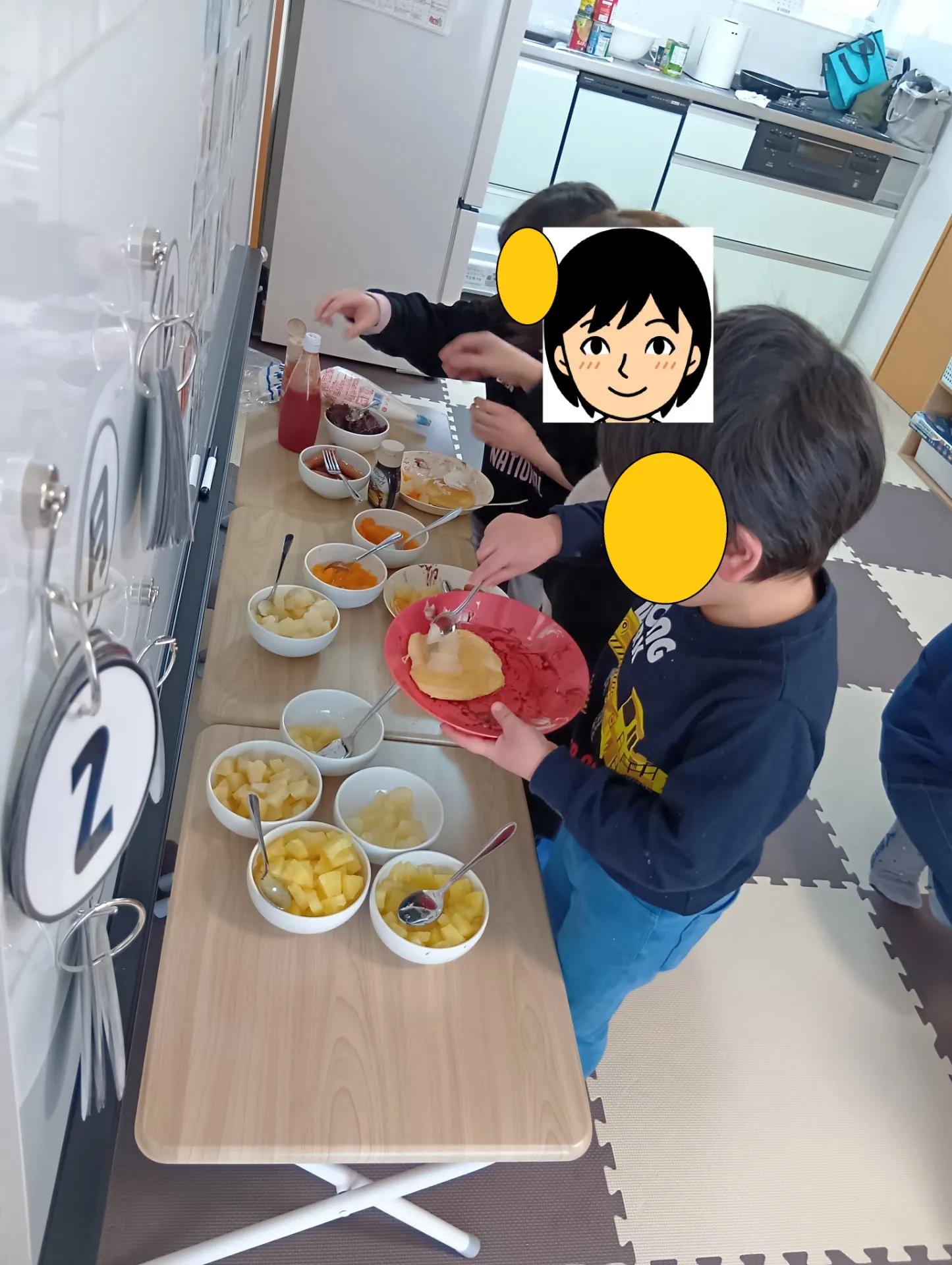 自分たちで焼いたパンケーキに、自分たちで切ったデザートを盛り付けていきます。
